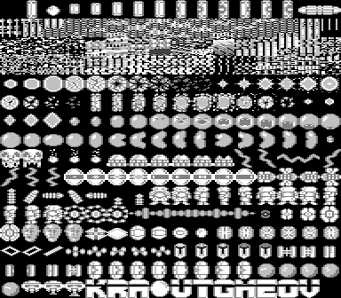 An image file containing sprite data will look somewhat like the below (from the game Krakout): spriterip accepts a number of options: -o is used to specify the output filename base; a bank number is appended to this to create four filenames. By default, spriterip assumes that sprite data is in 4-colour mode, with double-width pixels; the -m flag tells it to interpret sprite data as monochrome. The -v flag increases the verbosity of output messages. spriterip is a quick-and-dirty hack; its memory dump parsing is somewhat primitive and assumes that the RAM image is at a specific offset in the file. There is no guarantee that it will work with future versions of VICE, though it works well with 1.16 on Linux. spriterip needs a recent Python interpreter (it was developed on 2.3, though may work on earlier versions) and the Python imaging library. It, of course, comes with no warranty, express or implied, and is unsupported. If it does what you want, good for you; if not, too bad. |
